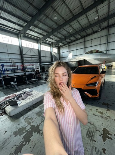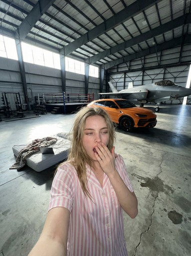 Wide photorealistic iPhone shot inside a massive industrial hangar. High metal ceilings, exposed beams, concrete floors. In the background: boxing ring, gym equipment, weight racks, an orange Lamborghini Urus parked to the side, a low mattress on the floor with messy blanket and laptop — raw, lived-in atmosphere. Behind everything, a large modern U.S. fighter jet parked inside the hangar, dramatic scale but naturally integrated into the space. The woman is positioned close to the camera in the foreground. She looks sleepy, as if she just woke up. Mid-yawn, one hand slightly covering her mouth, eyes half-closed, messy hair, relaxed posture. Natural, imperfect morning expression — not posed, candid energy. Lighting: early morning industrial light mixed with harsh direct on-camera iPhone flash. Foreground strongly lit with sharp shadows falling behind her. Slight overexposure on skin highlights, realistic grain, raw flash reflections on the floor and metal surfaces. Shot feels spontaneous, imperfect, documentary-style. No studio polish. Her face must remain 100% identical to the uploaded portrait — exact structure, proportions, skin texture. No beautification, no facial alteration. Mood: surreal everyday luxury, “just woke up in a hangar” realism, bold but casual.